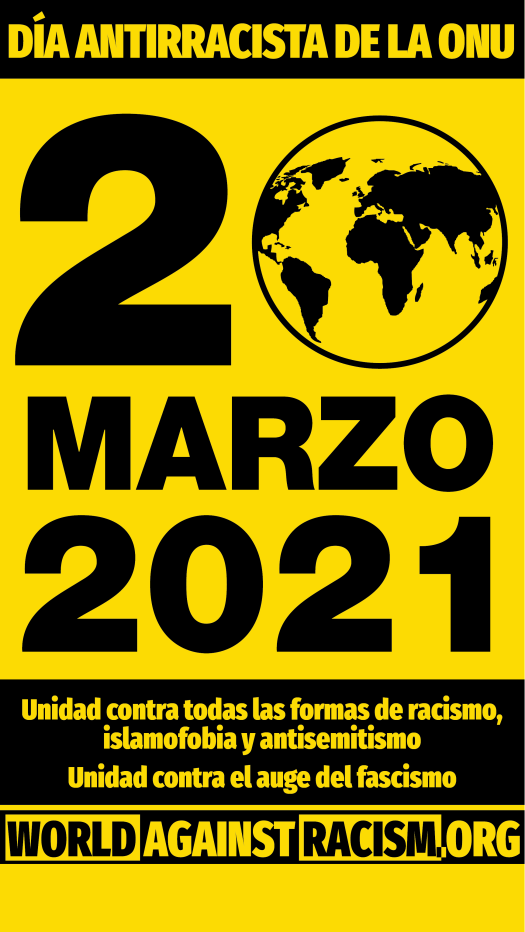 El sábado, 20 de marzo de 2021, nos reuniremos nuevamente para celebrar un día mundial de protesta, en la jornada contra el racismo de la ONU. En muchos países, se llevarán a cabo acciones de #WorldAgainstRacism contra todas las formas de racismo, islamofobia y antisemitismo, frente a los intentos racistas de convertir a las personas refugiadas o migradas y a las comunidades roma/gitanas en chivos expiatorios, y en solidaridad con el movimiento #BlackLivesMatter. El antirracismo destacará la importancia de nuestra unidad frente a la división e insistirá en que debemos unirnos para desafiar la amenaza del populismo racista, la extrema derecha y el fascismo.